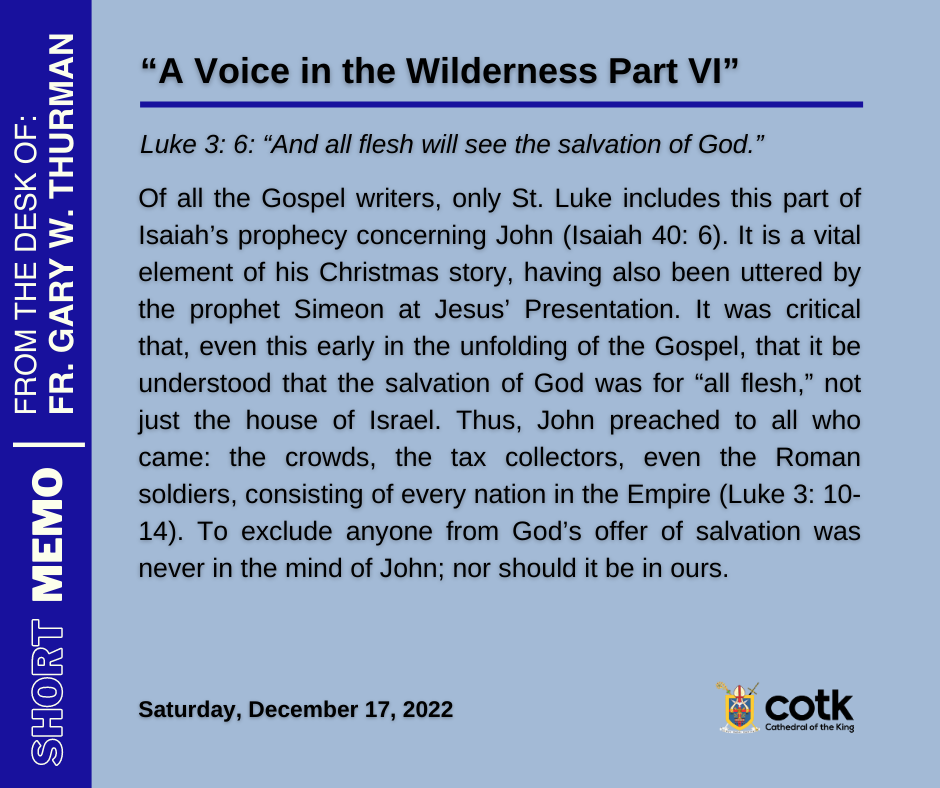 Saturday, December 17, 2022, "A Voice in the Wilderness Part VI"Fr. Gary ThurmanDec 17, 20220 min read